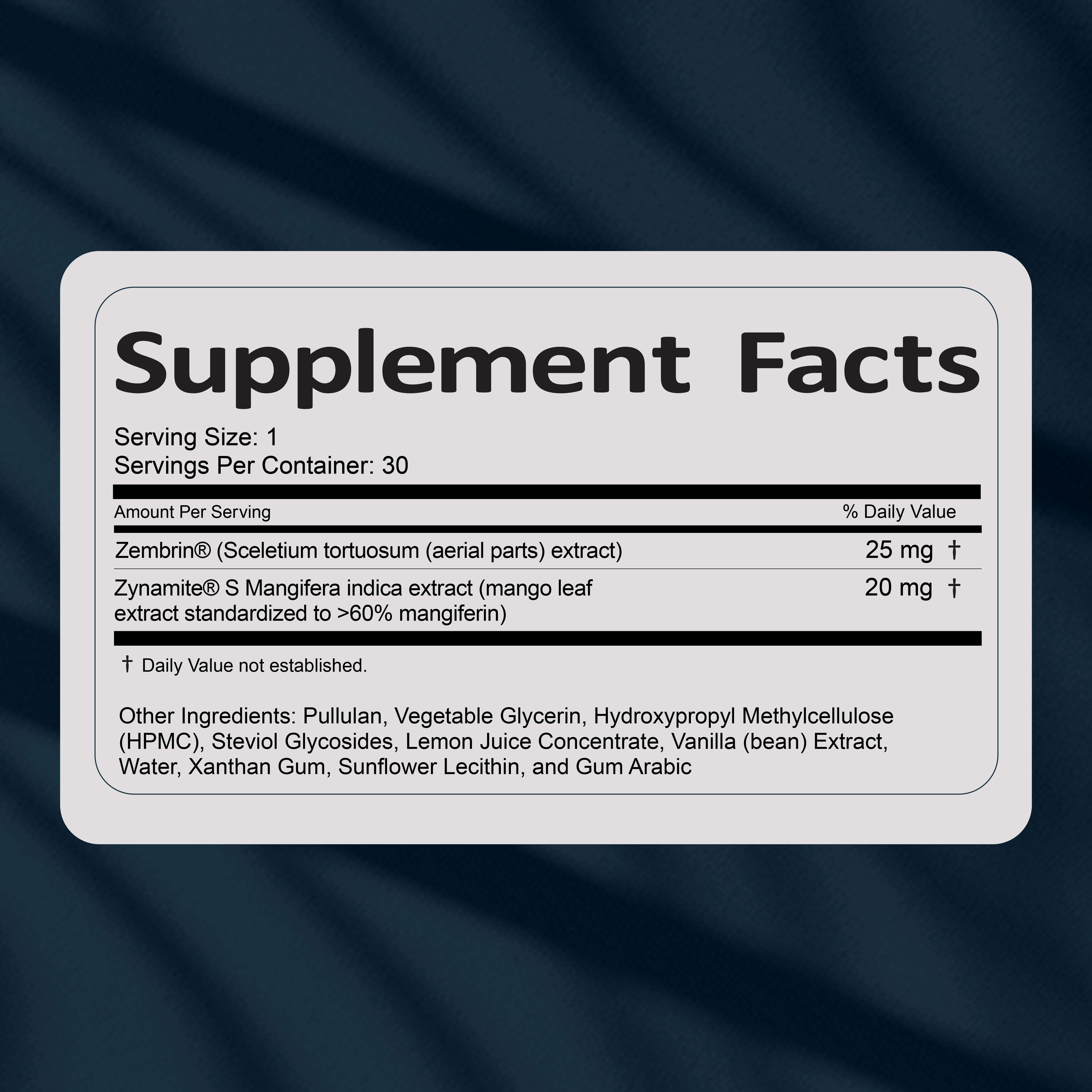 Calm is a dissolvable honey tea-flavored strip for anxiety relief, mental focus, mood and stress support that has an instant calming effect the moment you place it on your tongue. Formulated with Zembrin® and Zynamite® – two clinically studied ingredients for anxiety, mood and mental resilience –  Calm offers a natural, non-sedative approach to calming your nervous system the moment stress hits.